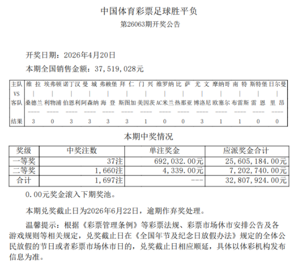 北京时间4月20日,足彩第26063期开奖结果揭晓。本期一等奖开出37注,单注奖金692,032元,8,796,675.33元滚存被清空;二等奖开出1660注4339元;任九开6241注2314元。本期胜负彩销量为37,519,028元,任九投注总额为22,572,232元。