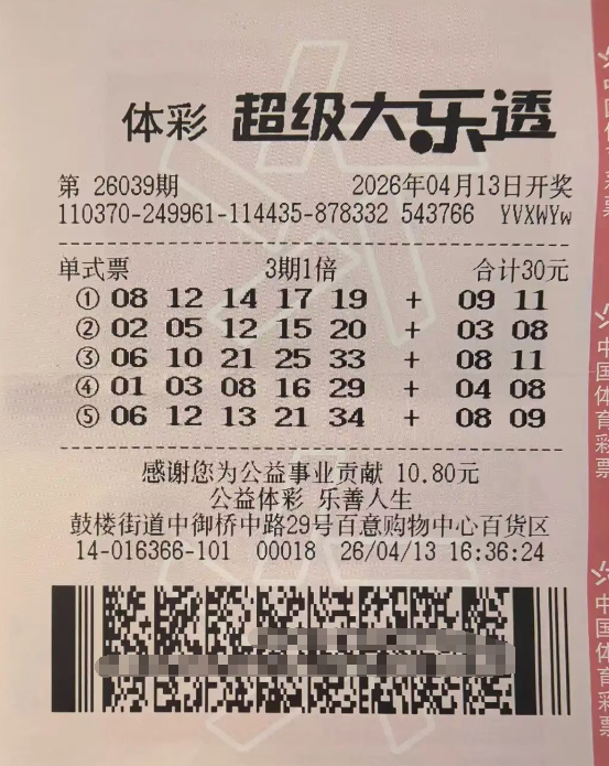 4月15日,超级大乐透第26040期开奖,中奖号码为“06、12、13、21、34 + 08、09”。当期全国共中出6注一等奖,其中山东省唯一1注花落济宁市兖州区。