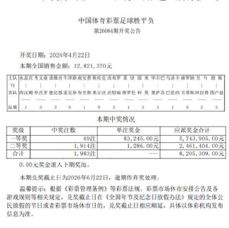 北京时间4月22日,足彩第26064期开奖结果揭晓。本期一等奖开出69注,单注奖金83245元;二等奖开出1914注1286元;任九开7886注1179元。本期胜负彩销量为12,821,370元,任九投注总额为14,533,256元。