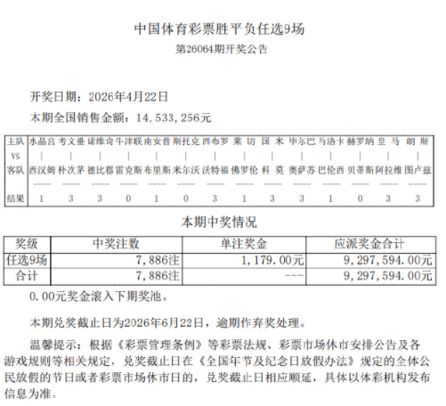 北京时间4月22日,足彩第26064期任九开奖结果揭晓。本期任九开7886注1179元。本期任九投注总额为14,533,256元。