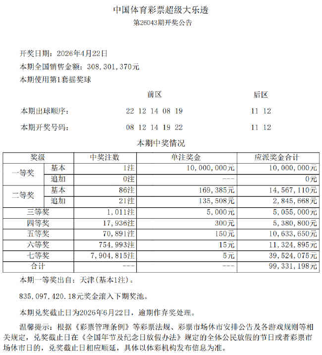 北京时间4月22日晚,体彩大乐透第26043期开奖,当期开奖号码为前区08 12 14 19 22,后区11 12。