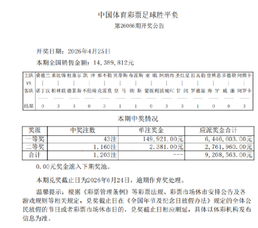 北京时间4月25日,足彩第25066期开奖结果揭晓。本期一等奖开出43注,单注奖金149,921元;二等奖开出1160注2381元;任九开8653注1378元。本期足彩销量为14,389,812元,任九投注总额为18,631,888元。