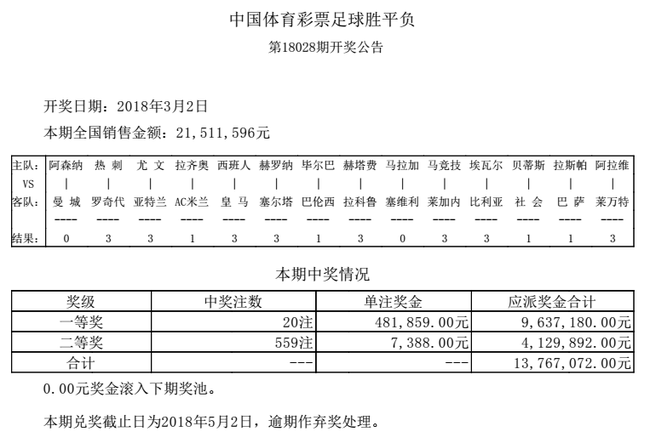 北京时间3月2日,胜负彩第18028期开奖结果揭晓。本期一等奖中出20注,单注奖金48.1万元;二等奖开出559注,单注奖金7388元;任九开2661注4938元;本期投注总额21,511,596元,任九投注总额20,533,404元。