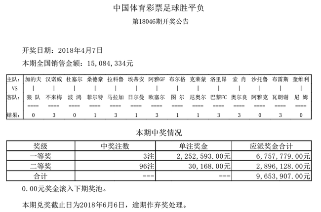北京时间4月7日,胜负彩第18046期开奖结果揭晓。本期一等奖中出3注,单注奖金225万元,二等奖96注30,168元;任九开1049注12,686元。本期胜负彩投注总额15,084,334元,任九投注总额20,793,314元。