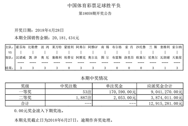 北京时间4月28日,胜负彩第18059期开奖结果揭晓。本期头奖开53注17万;二等奖开出1887注,单注奖金2053元;任九开12161注1130元。本期胜负彩销量为20,181,434元,任九投注总额为21,484,160元。