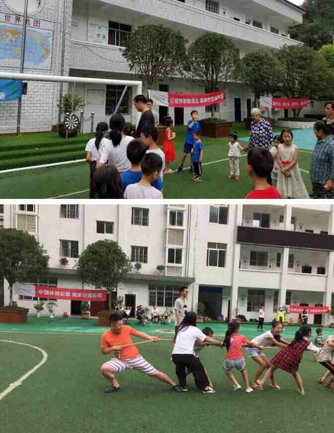 在城口县沿河乡中心小学,市体彩中心工作人员为当地的孩子带去了趣味运动会活动、体育与体育精神的宣传教育活动,与孩子们一起进行拔河比赛、飞镖大赛、篮球比赛等趣味体育项目,教孩子们从小养成热爱运动的好习惯。