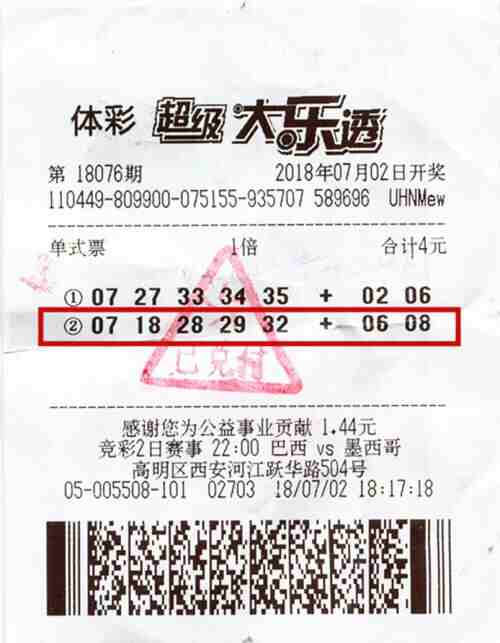 梁女士的中奖票是1张4元2注的大乐透单式票,其中1注中得第18076期大乐透头奖781万元,中奖号码为“07、18、28、29、32”,后区号码“06、08”。当期全国爆出4注头奖,基本投注奖金781万元,追加投注奖金1250万元,分别被广东佛山高明(基本1注)、江苏(基本2注 追加2注)、山东(基本1注 追加1注)的购彩者擒获。可惜购彩者没有进行追加投注,少了400多万元奖金。
