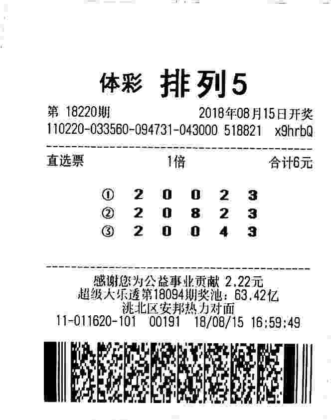 (特区小编资讯)中国体育彩票排列5第18220期于2018年8月15日开奖,开奖号码:20823。吉林白城市彩友王先生(化姓)喜中1注排列5直选,奖金10万元。