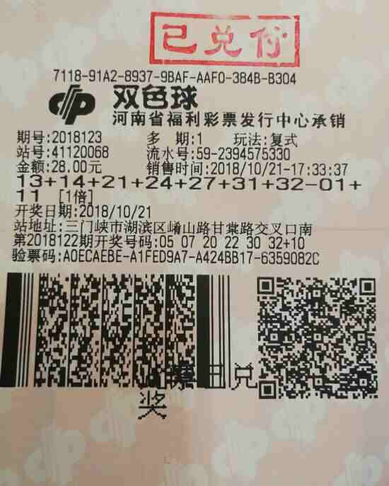 (特区小编资讯)10月21日晚,中国福利彩票双色球游戏进行第2018123期开奖,三门峡彩民喜获其中一注头等大奖。这注特别大奖投注方式为复式7+2,票面金额28元,中得奖金共计1451万元。