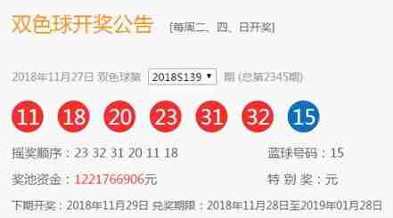 双色球第2018139期开奖,摇出红球号码11、18、20、23、31、32,;摇出大号奇数蓝球15。