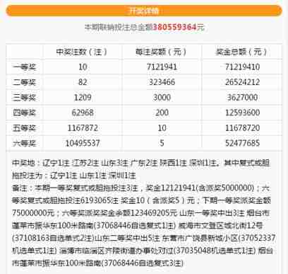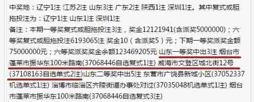 据检索,当期3注一等奖分别花落烟台与威海。其中,烟台市蓬莱市振华东100米路南37068446号投注站的彩友采用自选复式击中一注一等奖,还带走了500万的派奖奖金,拿下了1212万巨奖。威海市文登区城北街12号37108163号投注站的彩友,则是通过自选单式带走了2注712万一等奖!