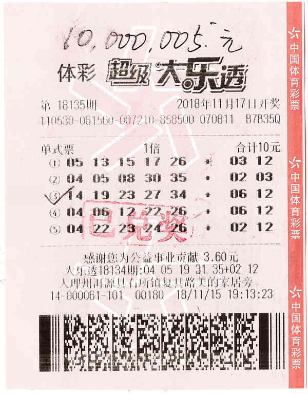 11月17日,在体彩大乐透 第18135期开奖中,姜先生凭借一张5注10元投入的单式票,拿下1注1000万元一等奖。