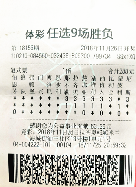 根据孟先生提供的中奖彩票显示,在本期投注中,孟先生以伯恩茅“0”、那不勒“31”、拉齐奥“31”、热那亚“310”、赛维利“31”、西班人“310”、比利亚“3”、蒙彼利“10”、尼斯“3”投注了一张面值为288元的复式票。正是这张复式票,孟先生**猜中冷门,以288元的投入换取了10多万元的奖金回报。
