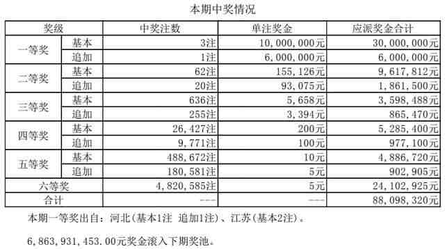 头奖3注1000万,1注追加,可多得600万。其中,河北(基本1注 追加1注)、江苏(基本2注)。