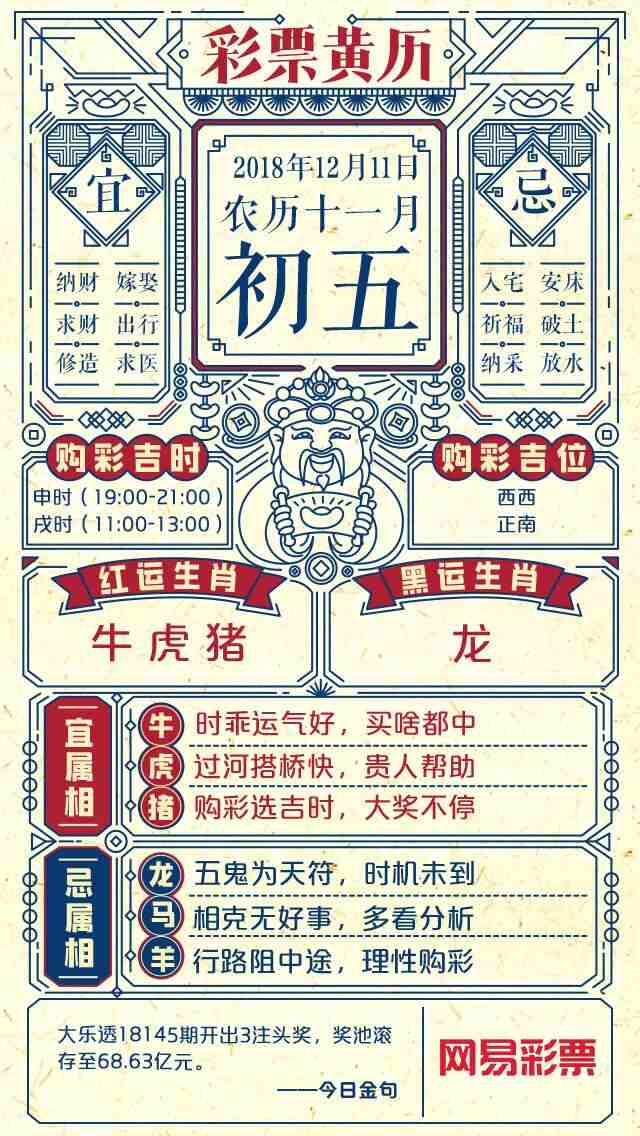 天地玄黄,宇宙洪荒;日月盈昃,辰宿列张。彩票黄历宜忌事项,推定每日吉时、吉位、红运生肖,爱好购彩而时难中奖者可多多参考。正所谓:困龙得水好运交,不由喜气上眉梢,一切谋望皆如意,向后时运渐渐高。