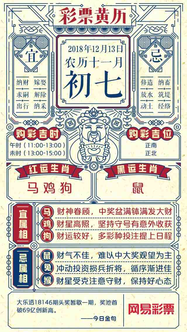 天地玄黄,宇宙洪荒;日月盈昃,辰宿列张。彩票黄历宜忌事项,推定每日吉时、吉位、红运生肖,爱好购彩而时难中奖者可多多参考。正所谓:困龙得水好运交,不由喜气上眉梢,一切谋望皆如意,向后时运渐渐高。