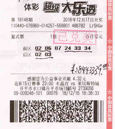 (特区小编资讯)12月17日,大乐透第18148期开出号码“02 06 24 33 34 + 02 03”,全国共送出6注头奖,包括1注1345万元追加投注头奖和5注841万元基本投注头奖。其中,江门开平市水口镇升平市场1幢6号的4409009248体彩网点彩友张先生凭借一张6+2的复式投票,投入仅12元,便中得一等奖1注,三等奖5注,单票收获奖金844万元。