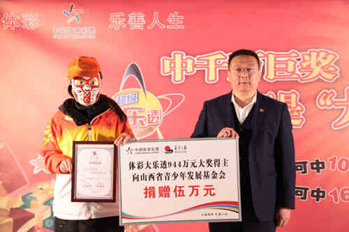 12月3日,体彩大乐透 第18142期,我省太原购彩者喜获当期大奖,凭借一张11+3复式票,共收获一等奖1注,二等奖2注,三等奖30注,四等奖210注及若干小奖,总计中得奖金944余万元。12月20日,大奖得主A女士来到山西省体彩中心领取大奖,并向山西省青少年发展基金会捐款5万元,用于支持社会公益事业。太原市体育局副局长李永昌为大奖得主颁奖,山西省青少年发展基金会秘书长张华为中奖者颁发了捐赠证书。