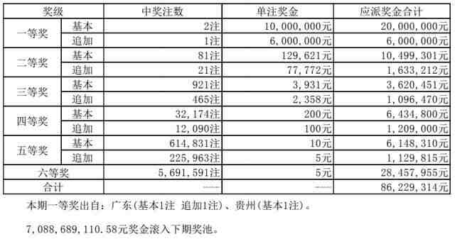 本期头奖2注,单注奖金1000万元,1注追加,单注奖金600万。本期一等奖出自:广东(基本1注 追加1注)、贵州(基本1注)。
