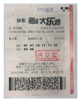 2018年12月19日,在体彩大乐透 第18149期开奖中,该幸运男子凭借一张6+2复式追加票,拿下1注1239万元追加投注一等奖及小奖若干注,合计收获奖金1242万元。