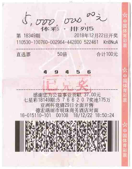 中奖彩票(特区小编资讯)12月22日晚,体育彩票排列5玩法第18349期开奖,当期全国中出87注,其中50注被我省德宏的一位幸运彩友揽获,奖金共计500万元。近日,中奖得主朱先生(化姓)独自一人来到云南省体彩中心兑奖。