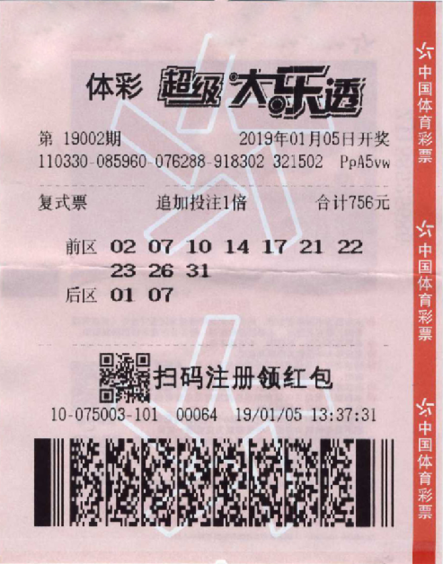 他们这张中奖彩票,是在台州马铺路421号体彩销售点购买的,中奖彩票是一张投注金额756元的10+2复式追加票,后区**锁定号码01、07。