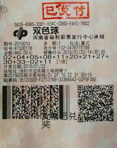 领奖现场(特区小编资讯)1月22日晚,中国福利彩票双色球游戏进行第2019010期开奖。当期开出的红球号码为02、04、05、08、11、30,蓝球号码为02。当期双色球头奖15注,单注奖金575万多元。这15注一等奖花落9地,河南省洛阳偃师彩民擒获其中一注。这注出自洛阳市迎宾路土地局楼下第41530118号投注站的大奖,投注方式为复式10+2,票面金额840元,中得奖金合计592万元。