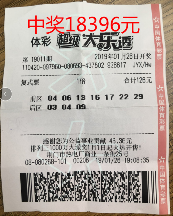 1月26日晚上7点,刘先生在荆门80268体彩销售点购买了一张大乐透7+3复式票,当期开奖号码:04 12 13 16 17+04 09。刘先生购买的彩票共中得三等奖3注,四、五、六等奖若干注,奖金合计18396元。