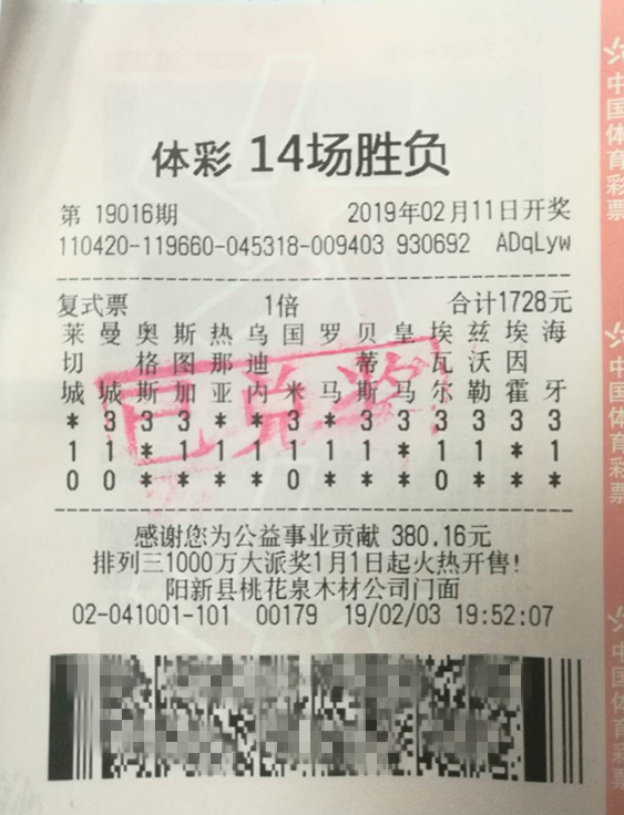 该中奖票是购彩者于2月3日购买的1728元复式单倍投注,命中全部14场胜负结果,经过春节7天的等待,终中得大奖380万元。据彩票网点业主胡先生说:“购买这张彩票的是店里的一个老购彩者,平时就喜欢14场玩法,喜欢抓冷门。这一回好运降临,14场被他全部猜中,新年开门第一件事,就是领大奖红包,别提多开心了!”