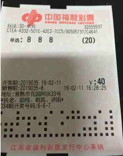 据检索该彩票出自32055537花园浜站点,出票时间为2月11日下午4点28分,是张单选20倍彩票,谢先生老家在河南,过年回家后刚来到常熟,当天就来到彩票店随手打了个豹子888,也希望今年能像彩票的数字一样大吉大利,没想到当晚开奖号码果真开了888,隔天谢先生就来到福彩中心兑奖,也希望今年也能红红火火。