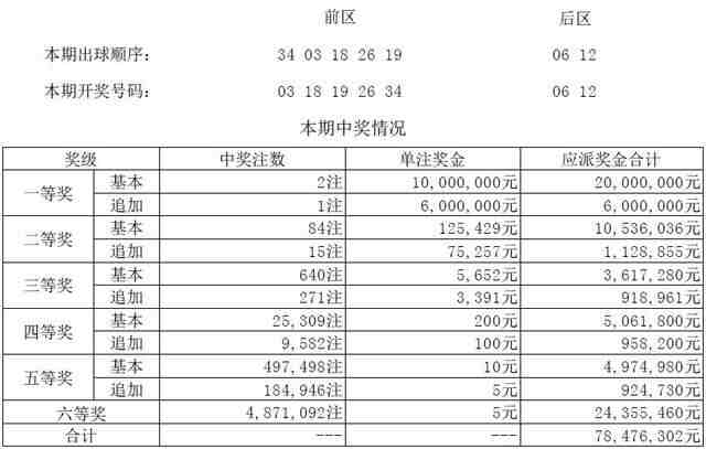 大乐透第19018期开奖号码:03 18 19 26 34 + 06 12