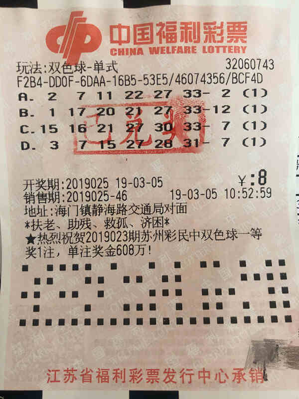 3月5日晚,福彩双色球第2019025期开奖,开奖号码为红球15、16、21、27、30、33,蓝球4。本期双色球二等奖江苏省共中出6注,位于海门市静海路交通局对面的32060743福彩站点喜获其中一注双色球二等奖,奖金达378350元。