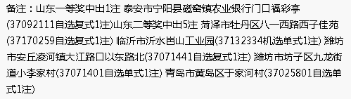 ????当期,山东还收获了5注二等奖,分别被菏泽、临沂、潍坊和青岛4个地市的彩友中得。