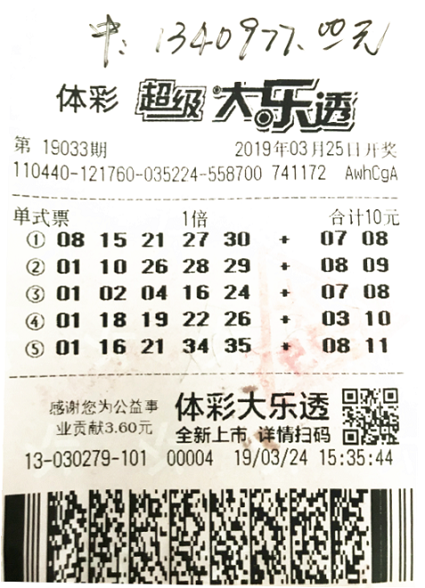 (特区小编资讯)3月25日,体彩大乐透 第19033期开出号码“01﹑02﹑04﹑16﹑24 + 07﹑09”,当期送出头奖3注,二等奖35注。其中,汕尾摘得二等奖1注,落在海丰县城新翠苑东九巷3号的体彩4413030279投注站。该站点一忠实购彩者以一张10元5注单式票投注大乐透,其中第三注号码擒获二等奖1注,喜获奖金共1340977元。