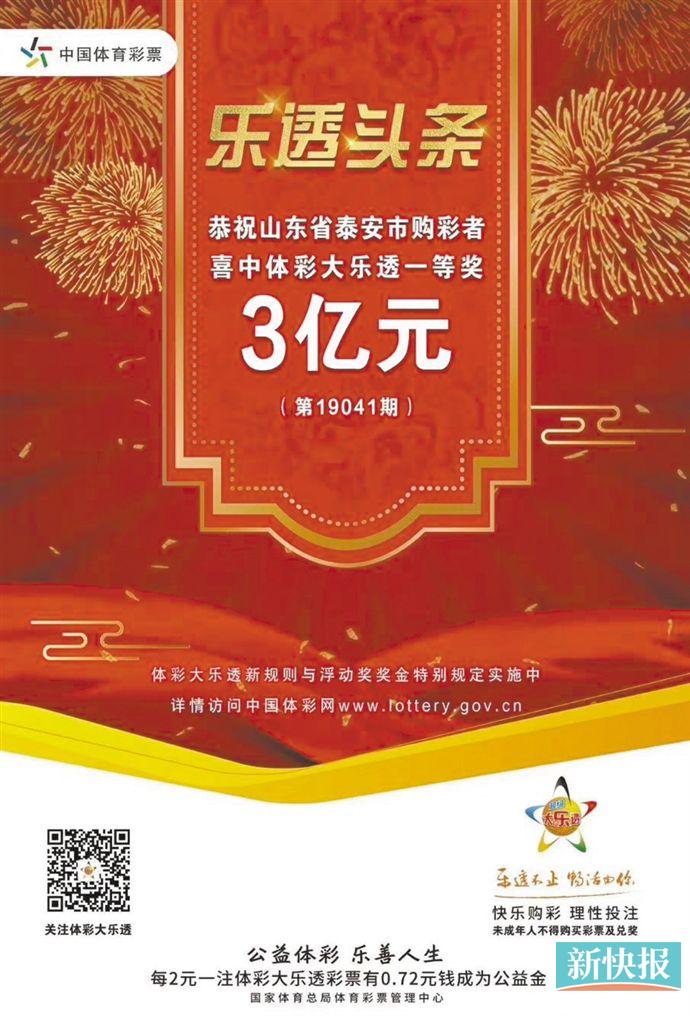 大乐透爆2019年首个亿元头奖!4月13日,体彩大乐透 第19041期开奖,全国共中出一等奖33注,其中山东省泰安市一位购彩者一举独中30注一等奖及若干小奖,共收获奖金3亿多元,成为体彩大乐透历史上的第13个亿元巨奖,且打入该玩法中奖榜第二名。