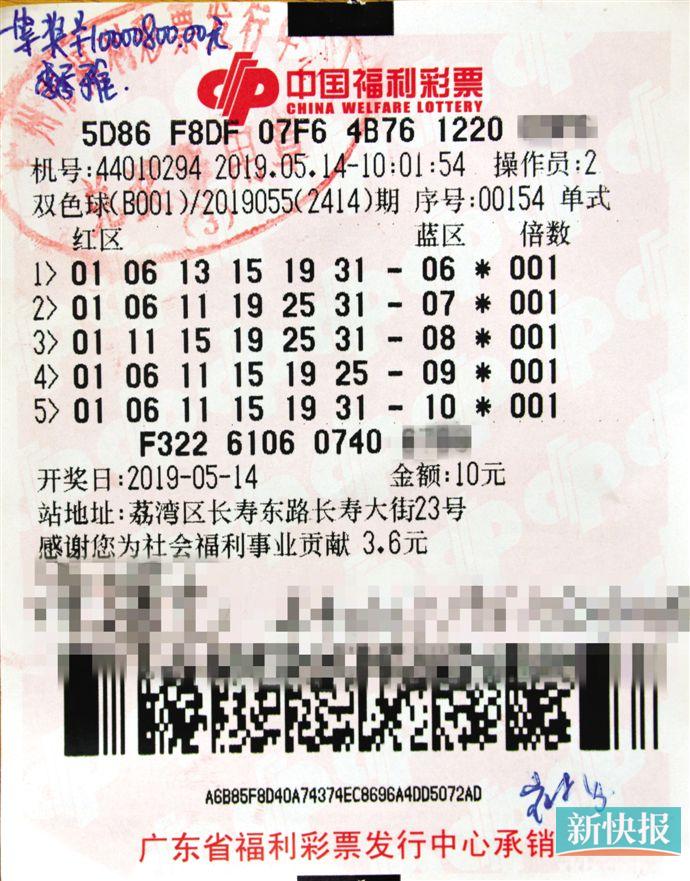 5月14日晚,双色球第19055期开奖,摇出中奖号码为:红球“01、06、11、15、19、31”;蓝球“10”。当期全国共中出两注一等奖,单注奖金1000万元。经检索,这2注头奖分别花落广东、河南两地,其中广东的1注头奖由广州彩民中得,中奖彩票为一张10元5注的自选单式票,由荔湾区长寿东路长寿大街23号44010294投注站售出。