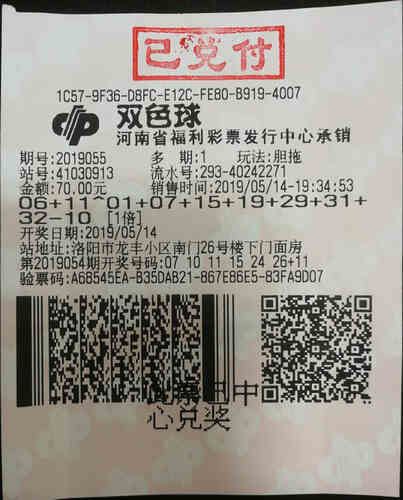 大奖得主领奖照5月14日晚,中国福利彩票双色球2019055期开奖,开出红球01、06、11、15、19、31,蓝球10。当期共开出一等奖两注,分落广东、河南两地。其中河南洛阳市龙丰小区南门26号楼下门面房41030913投注站中得一注,投注金额:70元,投注方式:胆拖,奖金:1003万元。