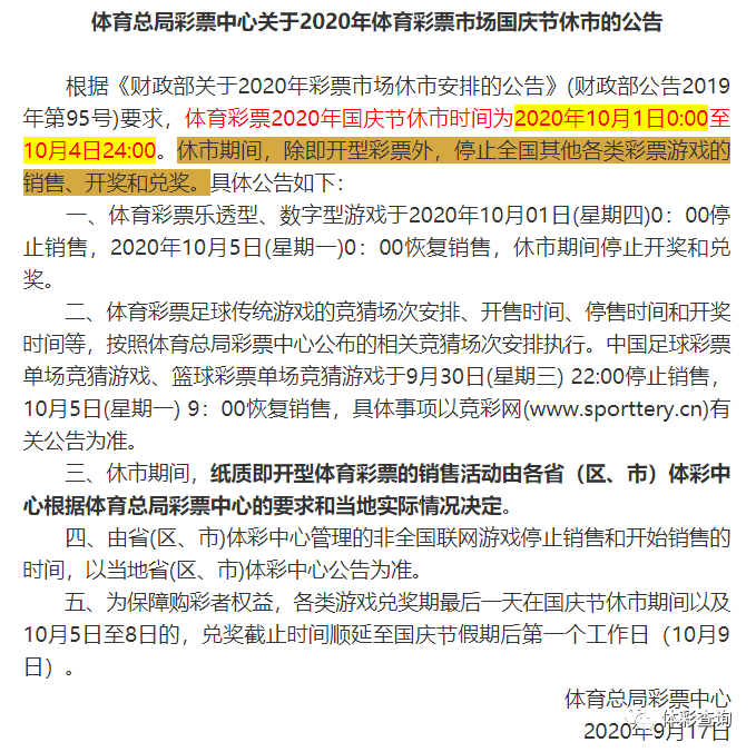 根据《彩票管理条例实施细则》和《国务院办公厅关于2020年部分节假日安排的通知》(国办发明电〔2019〕16号)的有关规定,现将2020年彩票市场休市安排公告如下: