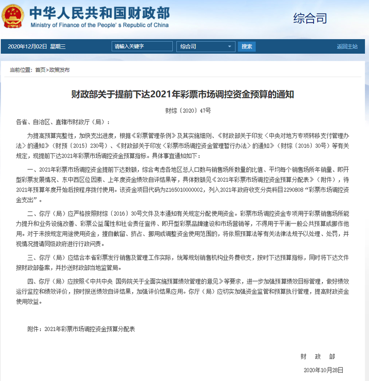 此次通知内容显示,各省市预算数额综合考虑了各地区总人口数与销售场所数量的比值、平均每个销售场所年销量、即开型彩票发展情况、东中西区位因素、上年度资金绩效自评结果等因素。资金用途方面与2020年彩票市场调控资金基本一致,业内人士认为,这显示明年彩票市场发展风向不变,将延续与推进今年的大部分工作。