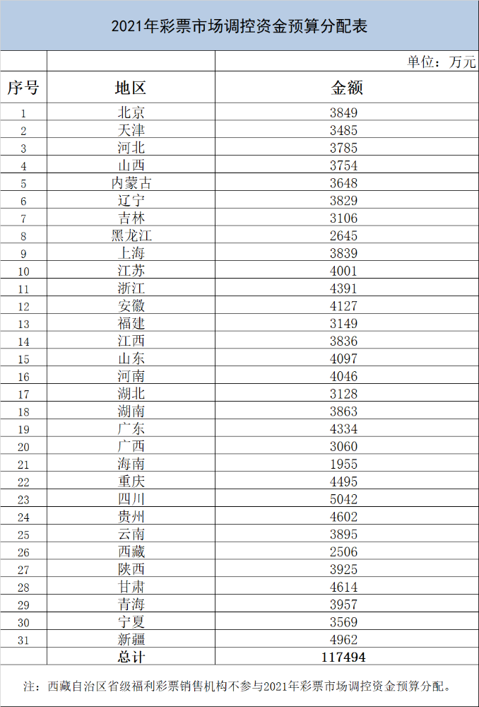 日前,财政部发布《关于提前下达2021年彩票市场调控资金预算的通知》(以下简称“通知”),通知显示,2021年彩票市场调控资金总计11.75亿元,将专项用于“彩票销售场所能力提升和业务设施改善、彩票公益属性和社会责任宣传、即开型彩票品牌建设和市场营销。”其中,四川省预算分配最高,为5042万元,西藏自治区福利彩票销售机构不参与2021年年彩票市场调控资金预算分配。
