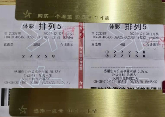 冷先生说,当天下午将近5点钟,他在94061体彩销售点投注了28倍“27258”。晚上7点56分钟,在将近停售的时候,他将“27258”和“72758”两个号码又在94010体彩销售点投注了4倍。没想到当晚开奖,他真的在不同的彩票店收获了两个大奖。