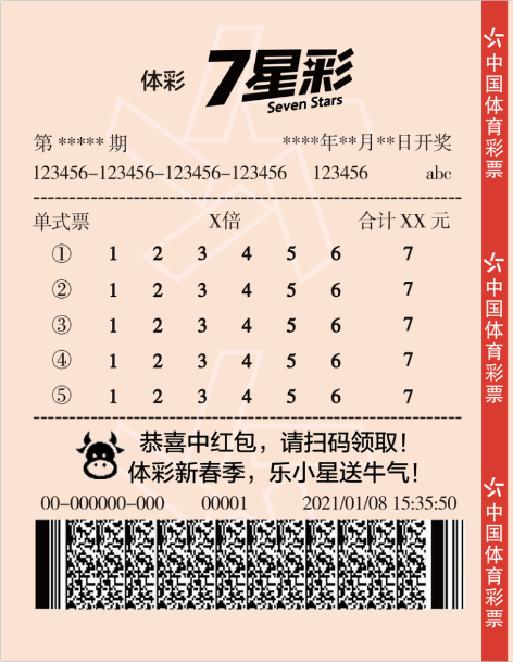 “7星”送惊喜,新春有好礼。2021年1月8日至19日,每周二、五、日9:00-20:00,只要在体彩实体店购买单票10元及以上的体彩7星彩,如票面宣传区出现特定图案“