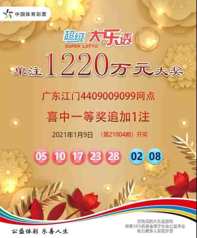 花落江门的追加一等奖,出自蓬江区群星阳和路边商铺,门店编号4409009099体彩实体店,中奖的彩票是6+2的10期追加投注票,除了中得1注追加一等奖外,还揽获5注四等奖,总揽奖金1222万余元。