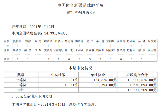 北京时间1月12日,胜负彩第21005期开奖结果揭晓。本期一等奖开出81注13.4万;二等奖开出1951注2394元;任九开出9800注1247元。本期胜负彩销量为24,331,648元,任九投注总额为19,109,594元。