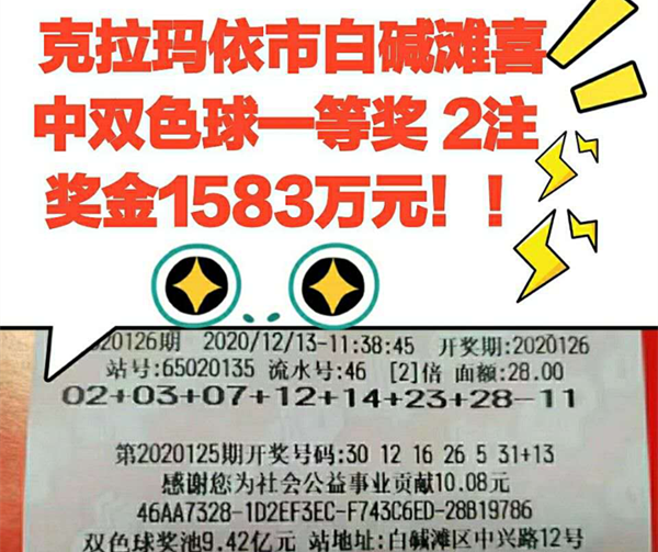 2020年12月13日,双色球2020126期开奖后,克拉玛依市白碱滩65020135投注站爆出千万大奖,轰动了克拉玛依市这座美丽的“油城”。彩民们为中奖幸运儿送上祝福,纷纷猜测千万大奖花落谁家?
