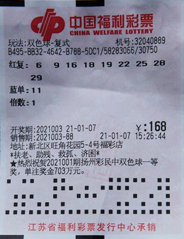 1月7日晚,双色球游戏进行第2021003期开奖。当期双色球红球号码为06、09、16、18、22、29,蓝球号码为11。当期双色球头奖5注,单注奖金为940万多元,这5注一等奖花落4地。当期江苏彩民分享了1注一等奖,这位幸运彩民来自常州市,幸运站点是常州市新北区旺角花园5-4号福彩店,购彩时间为2021年1月7日15时26分44秒。该彩民用复制“9+1”的红球复式票揽获一等奖1注、三等奖18注、四等奖45注、五等奖20注,共计奖金946万多元