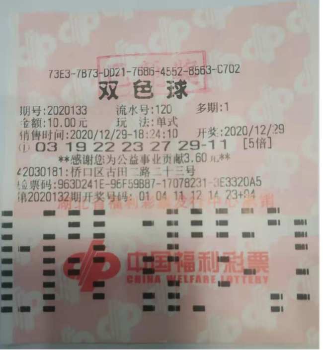 12月29日晚,福彩双色球第2020133期开出03、19、22、23、27、29+07的大奖号。当期我省中出7注单注奖金达28.38万的二等奖,而在这7注二等奖中,武汉硚口一彩民凭借一张单式5倍投注号,一举斩获5注二等奖,收获奖金141.9万,成为我省当期最大赢家。