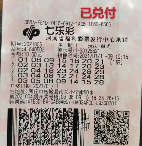 1月11日晚,福彩七乐彩第2021005期开出头奖2注,单注奖金为119万元,其中河南彩民收获1注,出自商丘市柘城县南关小学南50米41640502投注站,为一张单式投注票,收获总奖金1199777元。