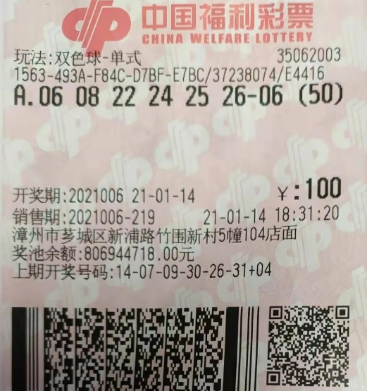 1月14日晚,中国福利彩票双色球游戏第2021006期开奖。福建彩民中得55注单注奖金为15万多元的二等奖,令人惊喜的是,其中50注出自漳州市芗城区新浦路竹围新村5幢104店面的福彩35062003投注站,中奖彩票是一张1注号码50倍投注的单式票,奖金总计765万多元。