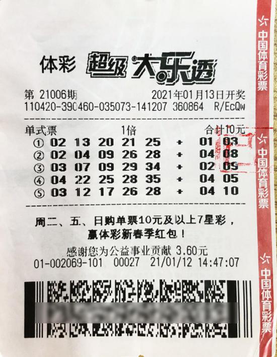 13日,在体彩大乐透第21006期开奖中,李先生通过一张5注号码、10元投入的单式票,中出1注1000万元一等奖。